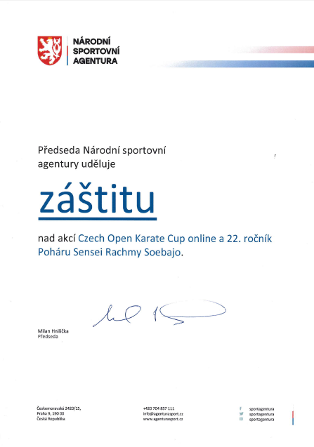 Záštita předsedy Národní sportovní agentury nad akcí Czech Open Karate Cup online a 22.ročník Poháru Sensei Rachmy Soebajo.